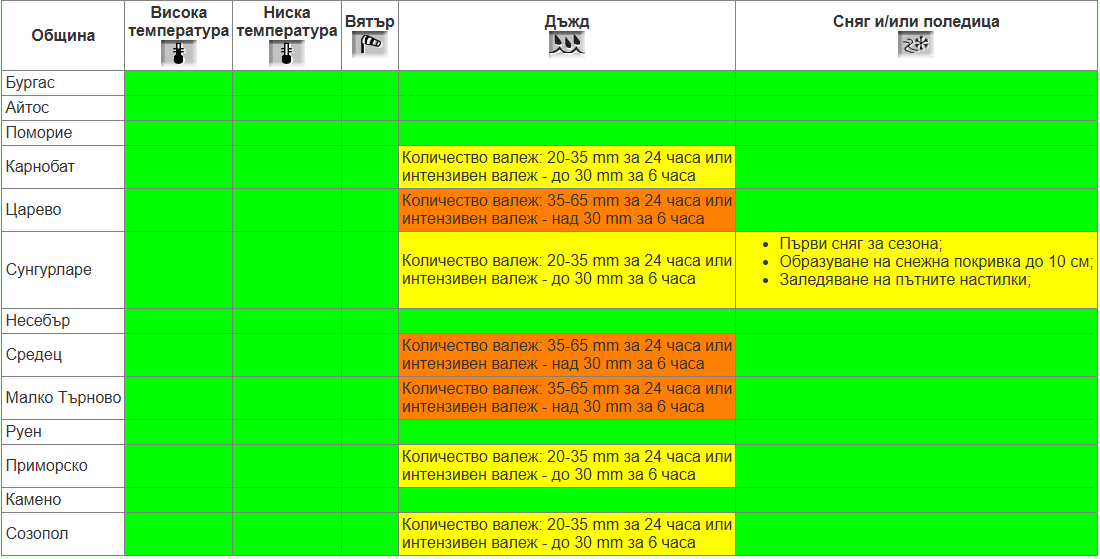 За други общини в региона като Карнобат, Сунгурларе, Приморско и Созопол е в сила жълт код. Прогнозите сочат валежи от 20 до 35 литра на квадратен метър за денонощие, като на места са възможни и краткотрайни, но интензивни превалявания.