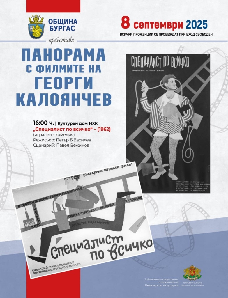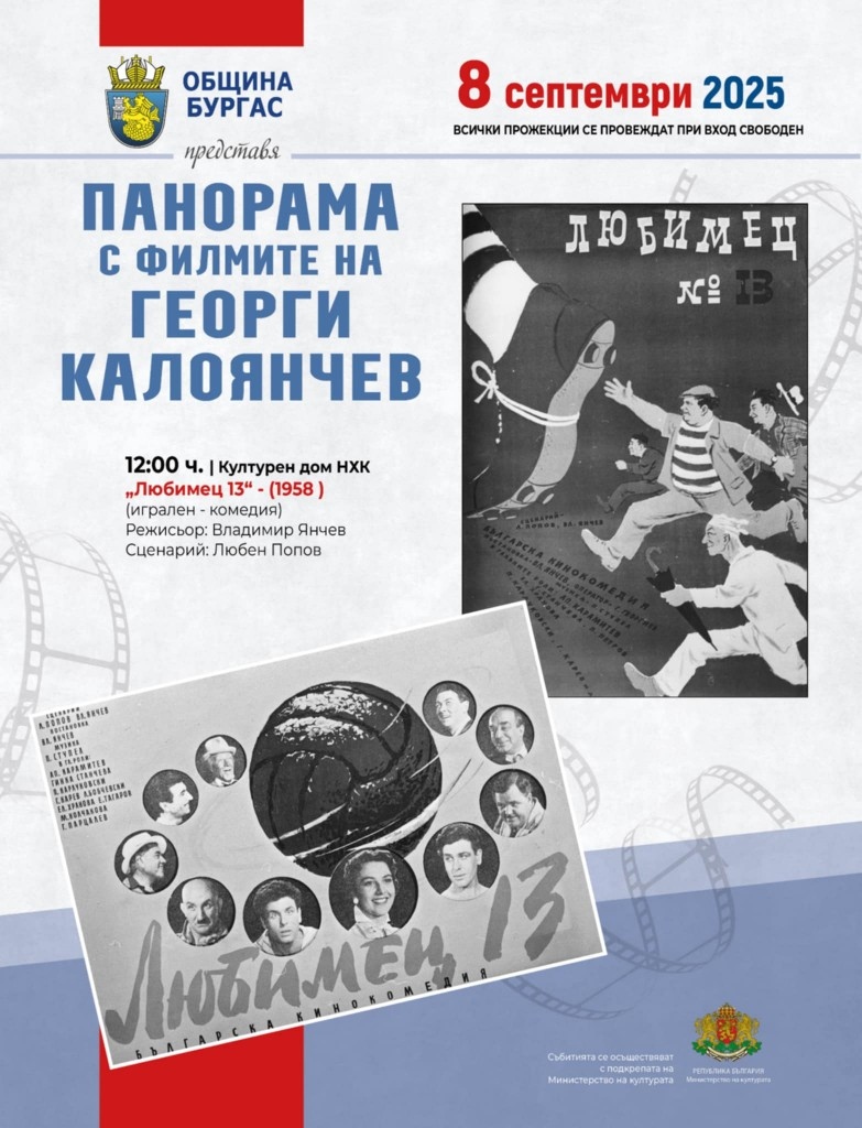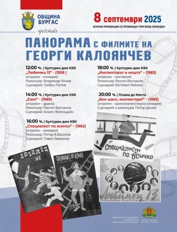 Фестивалът на смеха и комедията "Калата" и програмата посветена на 100 години от рождението на големия български актьор, родом от Бургас, Георги Калоянчев продължава с панорама с филмите му на 8 септември. Зрителите ще могат да видят два от емблематичните му филми, в които си партнира с друг велик бургазлия Апостолов Карамитев - "Любимец 13" и "Специалист по всичко".