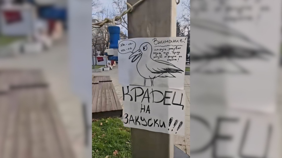 Импровизирана табела, появила се в района на площад „Тройката“ в Бургас, бързо привлече вниманието в социалните мрежи. На нея е изобразен зъл гларус, а надписът гласи: